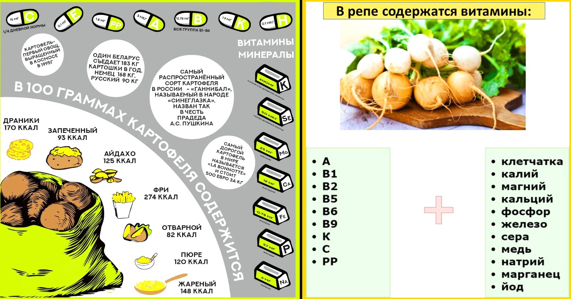 В России картофель появился в конце 17-го века. С этого времени он стал медленно, но уверенно вытеснять из рациона привычную репу. Это произошло по ряду причин. Прежде всего, правительство способствовало распространению картофеля, несмотря на активные протесты крестьян. Окончательно овощ стал привычным для населения к началу 20-го века. Маловероятно, что в то время люди сравнивали полезные свойства продуктов. Тем не менее, картофель богат на различные микроэлементы, аминокислоты, витамин С, пектины, витамины B1 и B2, клетчатку. Репа не уступает по уровню пользы, так как содержит много кальция, витаминов C, B1, B2, B5, фосфора и других элементов.