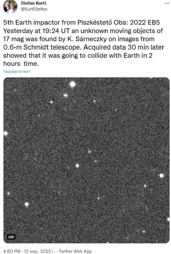 Одиннадцатого марта астроном Криштиан Сарнецкий с помощью телескопа Шмидта наблюдательной станции Пискештетё заметил небольшой каменистый объект. Спустя 2 часа он врезался в атмосферу Земли к северу от Исландии. По данным исследователя, небесное тело размером от 3 до 4 метров, приближалось к поверхности Земли на скорости 18 километров в секунду.
