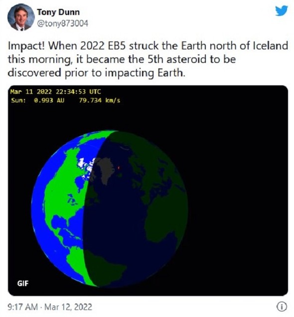 Международная метеорная организация, просит астрономов сообщить любую информацию касающуюся, падения метеора 2022 EB5. Вспышку света или взрыв могли наблюдать астрономы в Исландии, Гренландии или Норвегии.