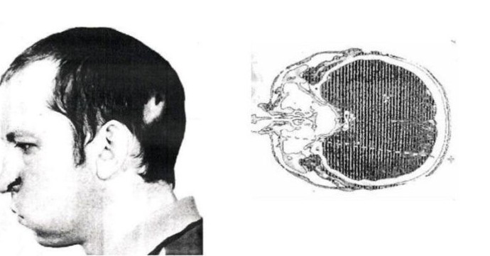 Опухшее лицо Анатолия Бугорского после аварии. На рисунке справа показан путь протонного пучка через его череп.