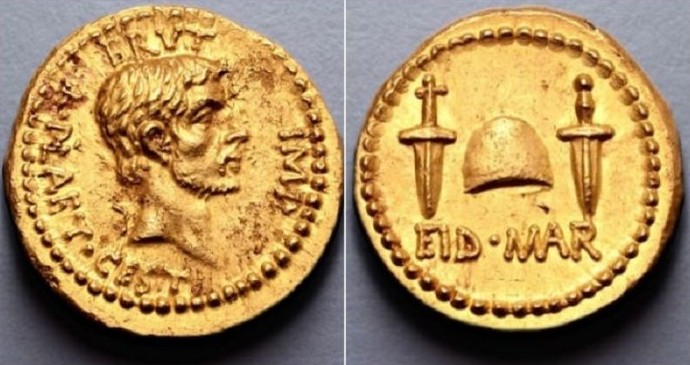 Всего таких монет три, если говорить о тех, о чьем существовании и местонахождении известно специалистам. Серебряных денариев Брута около сотни. Конечно же, отчеканено было значительно больше – эти монеты в 42-43 годах предназначались для расчетов с армией. За пару лет до этого произошло то событие, благодаря которому имя Брута было навечно вписано в историю. В 44 году до н.э., в день 15 марта, который именуется «Мартовские Иды», в результате заговора был убит Гай Юлий Цезарь.