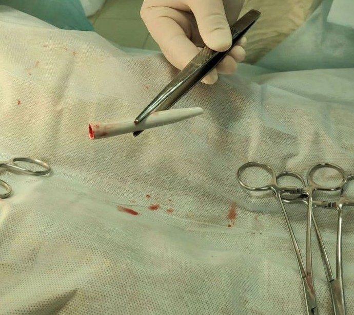 "Пациенту была проведена операция под спинномозговой анестезией: рассечение наружного отверстия уретры (меатотомия). Широкая часть ручки застряла в области ладьевидной ямки. Мы рассекли скальпелем ткани уретры и извлекли две части ручки, затем ушили края раны и наложили повязку", - раскрыл главный хирург медицинского учреждения Рустам Абдурахманов.