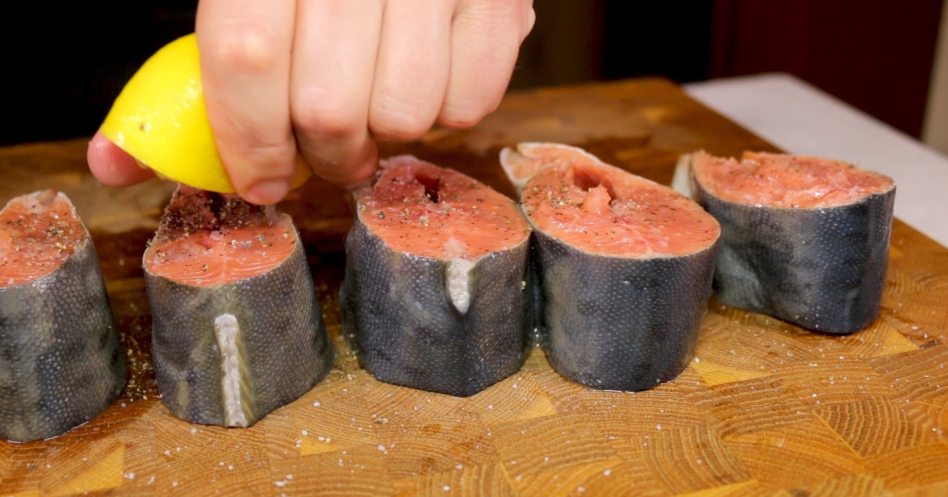 === Приготовление ===Берём тушку горбуши, у меня она потрошеная без головы и срезаем с неё плавники. Отрезаем хвост, а саму тушку рыбы разрезаем на порционные кусочки толщиной примерно 4 см. Получившиеся стейки из горбуши присаливаем достаточным количеством соли и приправляем свежемолотым перцем, а также поливаем их лимонным соком и убираем в холодильник подмариноваться.