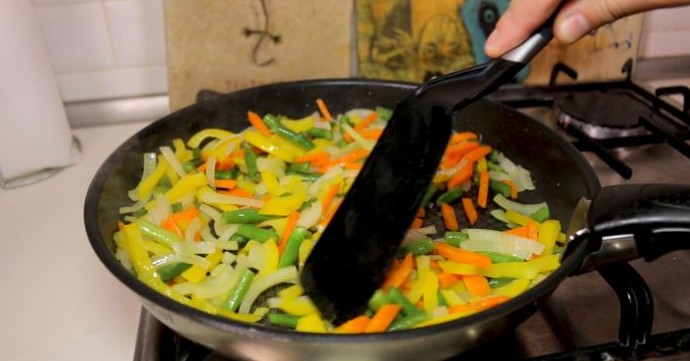Ставим сковороду на сильный огонь. Наливаем в неё масло и даём ему разогреться. Помещаем нарезанные овощи в сковороду с разогретым маслом добавив к ним 100 гр замороженной фасоли. Пассируем всё вместе в течении 5 мин помешивая. Затем присаливаем овощи, перемешиваем и снимаем с огня.