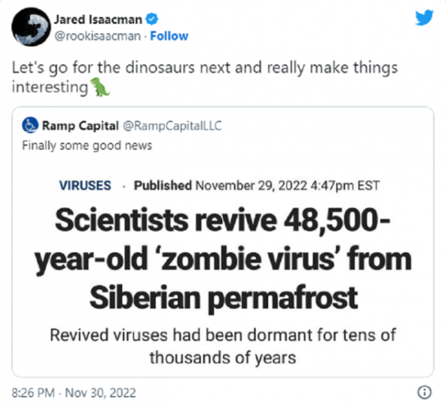И такой человек нашёлся, миллиардер Джаред Исаакман недавно предложил использовать ДНК динозавров, чтобы возродить древних обитателей нашей планеты, которые погибли миллионы лет назад. Такое предложение Исаакмана появилось на его страничке в Твиттере, после недавнего научного открытия, в котором команда европейских ученых вернула к жизни «зомби-вирус» из сибирской вечной мерзлоты. Сообщается, что этот вирус "спал" десятки тысяч лет.