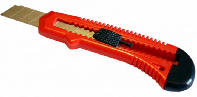 Заглушка на конце канцелярского ножаЕсть несколько способов отламывать затупившиеся секции канцелярского ножа. Можно, рискуя пальцами, делать это вручную, можно воспользоваться плоскогубцами, а можно повнимательнее присмотреться к самому ножу. На конце его рукоятки есть заглушка, которую можно снять, надеть на ненужную секцию лезвия и отломить её.