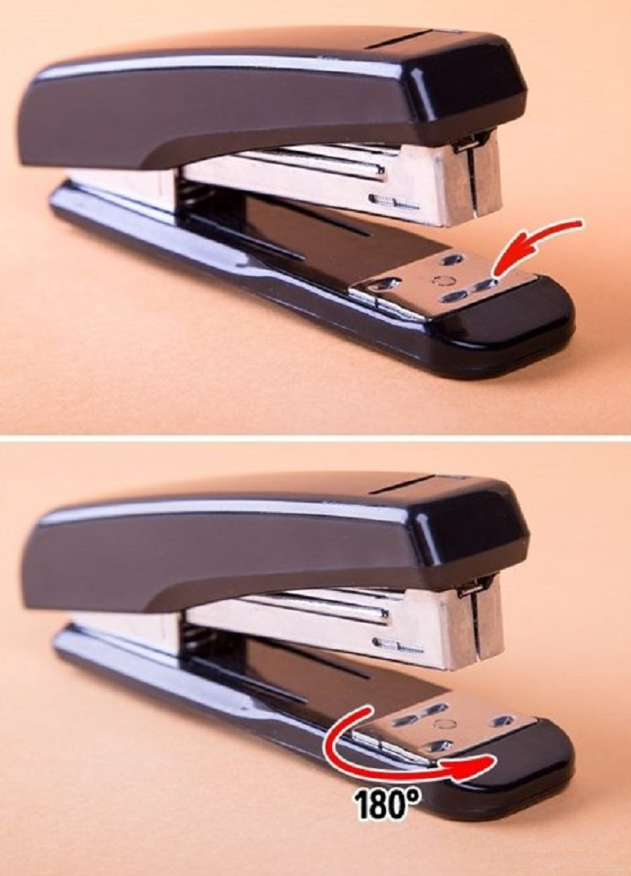 Платформа у степлера Очень удобная функция, о которой мы не знали и не использовали. Платформа на нижней части степлера, которая сгибает скобы, может поворачиваться на 180 градусов. И тогда концы скобок будут изгибаться снаружи, а не внутри. Это удобно, если вы хотите временно закрепить листы.