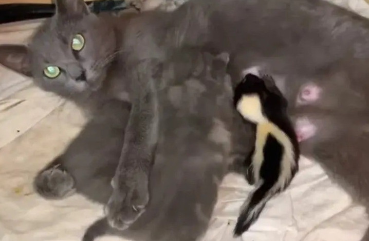 11. Кошка-мать, выкормила детеныша скунса, который потерял свою маму