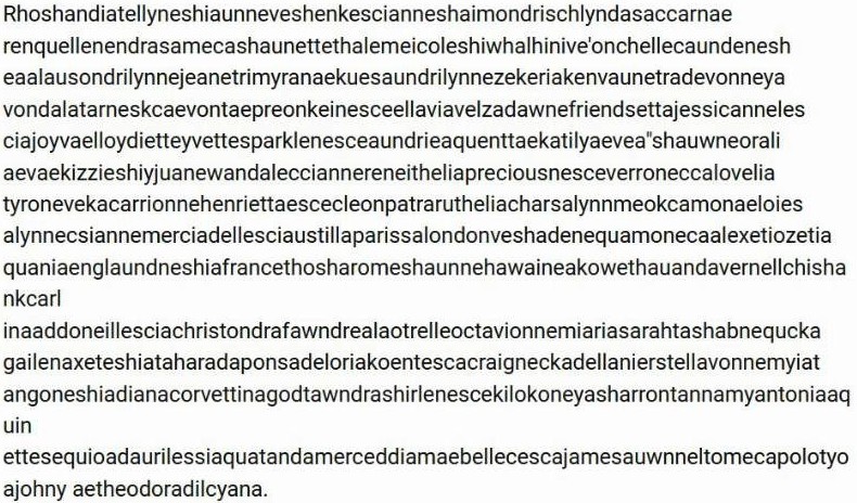 Сначала малышку назвали Rhoshandiatellyneshiaunneveshenk Koyaanisquatsiuth Williams. Но любящей маме имя показалось невыразительным и удручающе коротким. Тогда Сандра добавила еще букв и отчество из 36 знаков. Женщина обратилась в соответствующую государственную службу для внесения изменений. Отказать любящей матери не смогли, так как законы Техаса не предусматривали ограничений в длине имени.