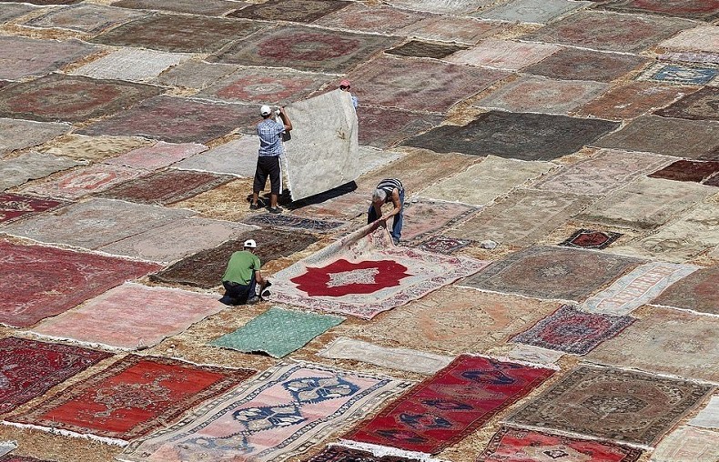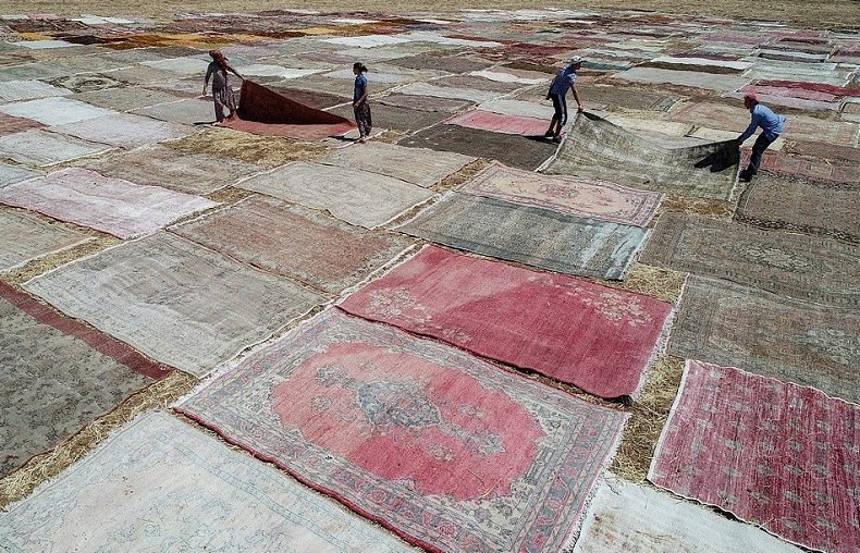 Высокие температуры помогают смягчить яркие красители, используемые в коврах ручной работы, в более приглушенные цвета античного стиля, которые предпочитают западные клиенты. Ковры пролежат около месяца, прежде их соберут, почистят и подготовят к продаже.
