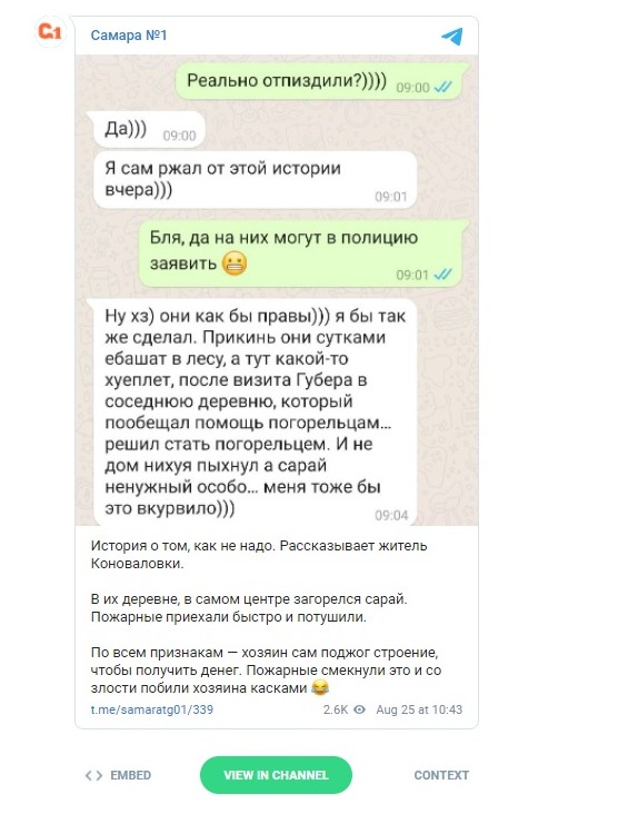 В телеграм-канале "Самара №1" опубликовали переписку местных жителей, где они выражали свою солидарность с действиями пожарных.