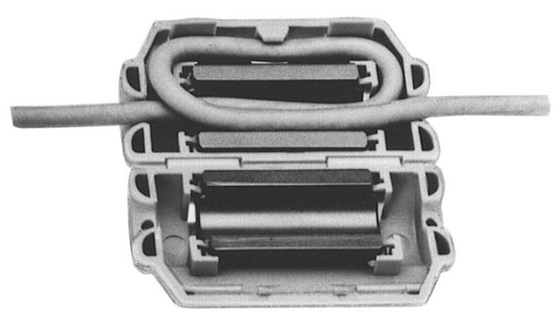 4. Если позволяют конструктивные особенности пары кабель – феррит, можно сделать несколько витков (как правило, один – два) кабеля вокруг ферритового сердечника. Обобщая вышесказанное, можно сказать, что наилучший ферритовый сердечник – самый длинный и толстый из тех, что могут быть размещены на конкретном кабеле. При этом внутренний диаметр кабельного феррита должен по возможности совпадать с внешним диаметром кабеля.