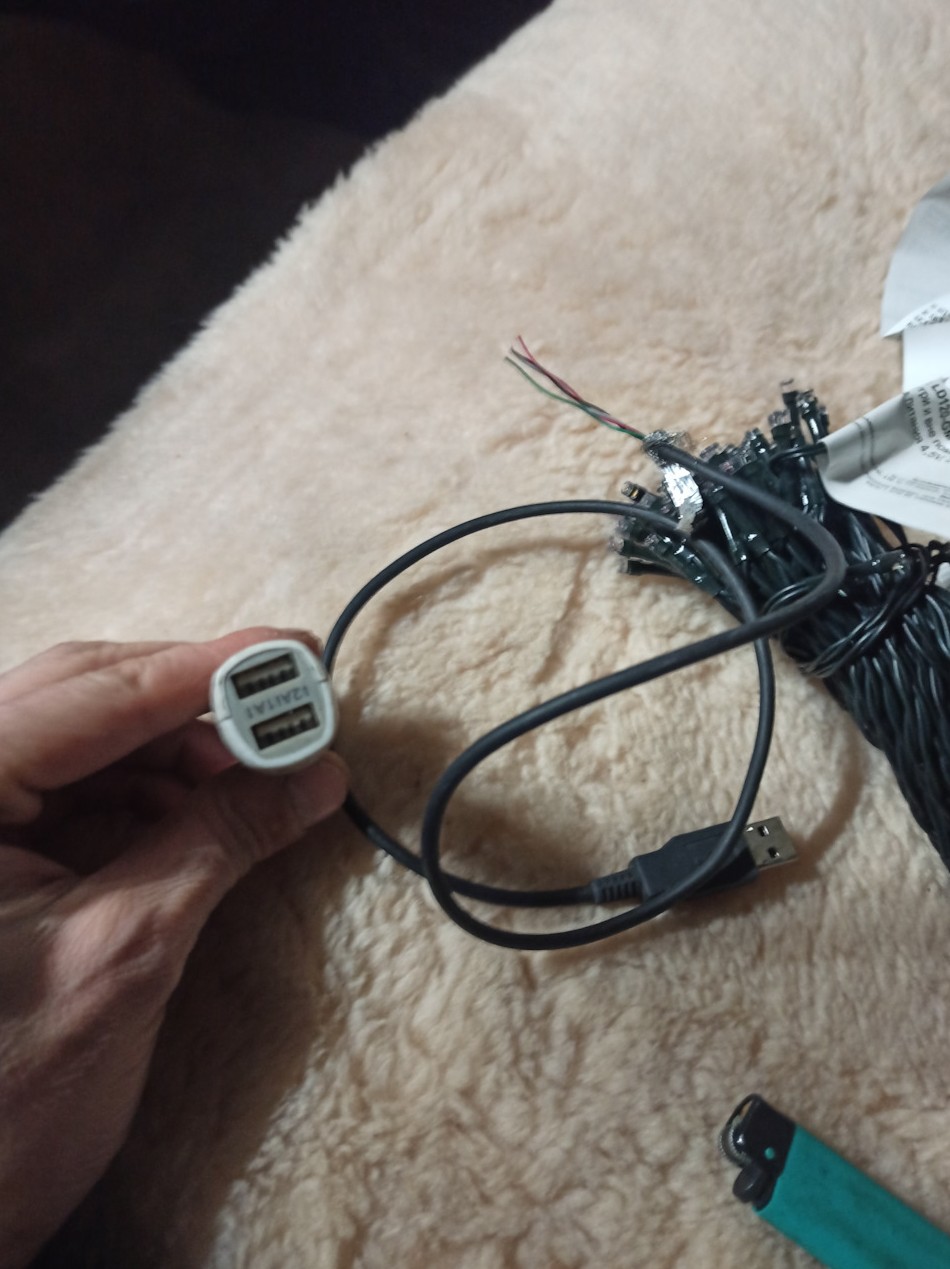 Просто взял старый шнур от телефона, обрезал, и кинул плюс и минус на бп гирлянды, все очень просто.
