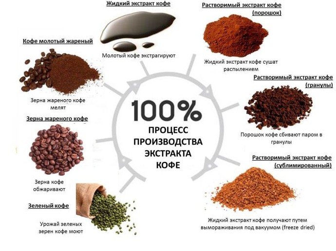 В основе производства – натуральные кофейные зерна сорта Робуста, которые большинство заводов приобретают в зеленом, не обжаренном виде. Арабика, привычная любителям натурального кофе, используется редко – богатый ароматом и полезными веществами сорт имеет небольшое содержание кофеина, в процессе обработки он испарился бы почти полностью. Робуста имеет в естественном составе больше кофеина, сорт оптимально подходит для такой глубокой переработки, которой подвергаются кофейные зерна при создании растворимого продукта.