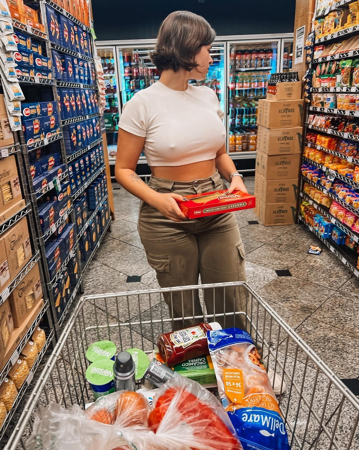 Керолай Чавес уверенно прогуливалась по продуктовому магазину в Бразилии, одетая в почти прозрачную белую майку без лифчика и джинсовые шорты с таким высоким вырезом, что они граничили с плавками от бикини.