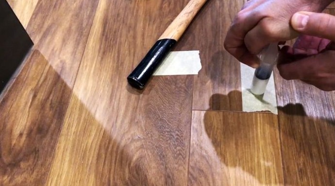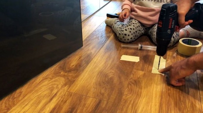 Первым делом находим места, где скрипит пол, и определяем центр углубления под ними. Затем приклеиваем сверху небольшой кусок малярной ленты. Далее просверливаем ламинат сквозь скотч, и убираем стружку пылесос.