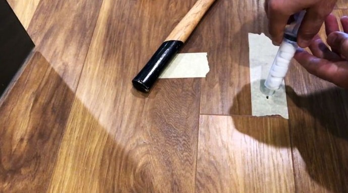 После этого набираем в шприц жидкие гвозди. Носик шприца нужно вставить в отверстие в ламинате, и выдавит клей.