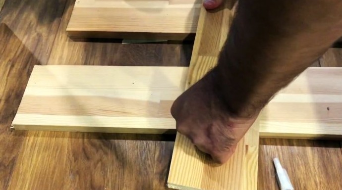 Как только мы убедились, что клея достаточно и впадина полностью заполнена, ставим на доски груз. Не убираем его, пока жидкие гвозди не высохнут.
