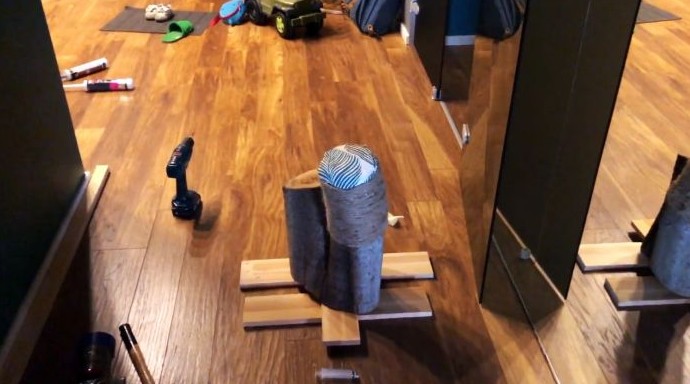 Затем убираем шприц, и укладываем по две стороны от отверстия дощечки, разместив их параллельно. На них кладем третью доску уже поперек, и нажимаем на нее. Эта конструкция позволяет задать клею точную плоскость, предотвратив получение бугорка. В итоге через отверстие под нагрузкой должно выйти немного клея. Если он не выдавился, то его мало, и нужно добавить.