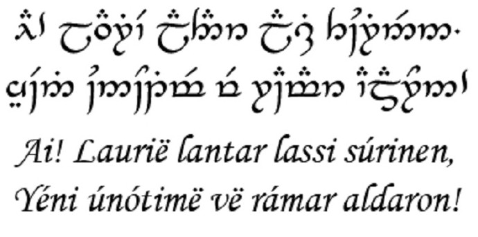 Пример эльфийского письма (тенгвар) и его транслитерации латиницей