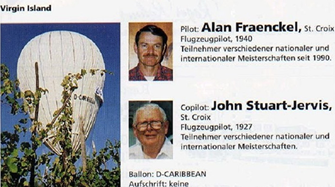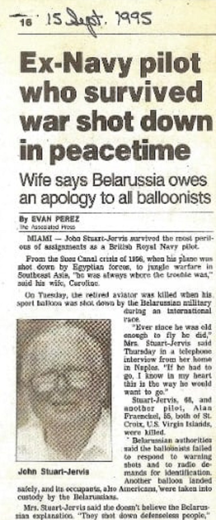 Ранним утром 12 сентября 1995 года границу Республики Беларусь пересек спортивный воздушный шар D-Caribbean, которым управляли американские аэронавты Алан Френкеля и Джон Стюарта-Джервиса. Оба спортсмена — пилоты на пенсии, имели огромный опыт воздухоплавания. Более того — Стюарт-Джервис был военным летчиком, воевал во Вьетнаме и Египте и даже был в 1956 году сбит недалеко от Сайгона.