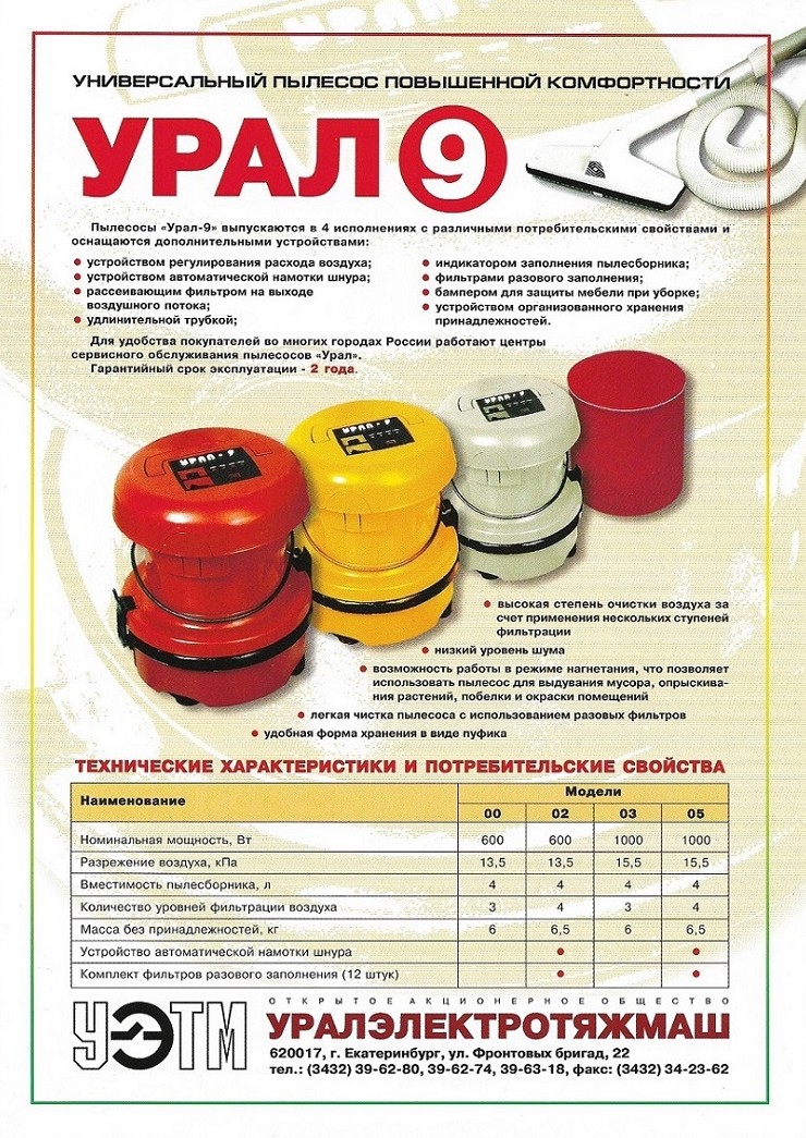 — Если качество свердловского пылесоса нареканий не вызывало (что и говорить, многие «Уралы» в строю по сей день), то, с точки зрения дизайна и уровня шума, производимого миасскими и карпинскими двигателями, он безоговорочно проигрывал конкуренции. Но «УЭТМ» и не думал сдаваться. На смену «Уралу-3» пришел «Урал-9» с полностью пластмассовым корпусом в пяти различных модификациях, — рассказывает Светлана Булатова.