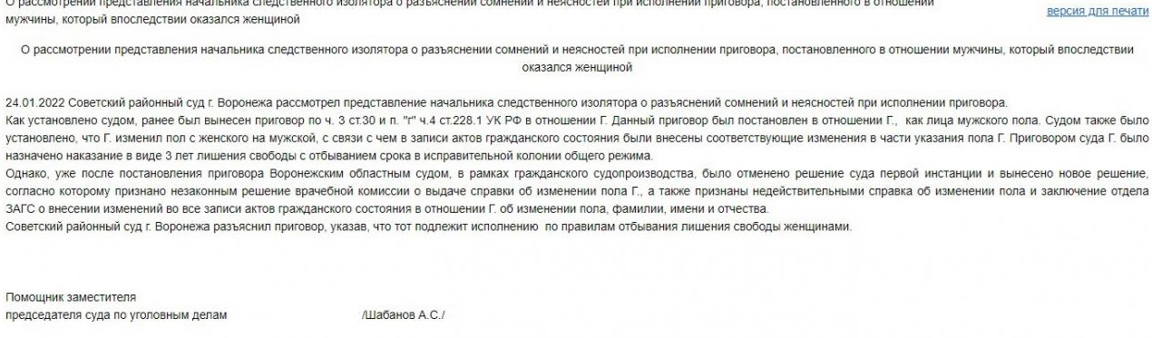 Уже после приговора Воронежский областной суд признал незаконным решение врачебной комиссии и аннулировал документы осужденного о смене пола.