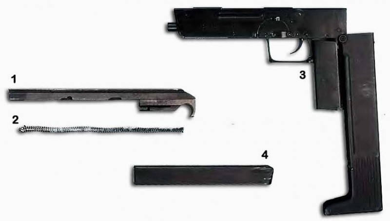 Конструкция оружия очень сильно напоминает складной нож «бабочку». При приведении пистолета-пулемета в боевое состояние, блок раскладывается на две части: ствольную коробку и приклад, по центру остается рукоять, она же приемник магазина. К сожалению, конструкция оружия такова, что хранить пистолет-пулемет в сложенном состоянии с магазином невозможно. Поэтому для того что бы начать стрелять из оружия его сначала нужно разложить, вставить магазин, взвести затвор, при этом по желанию необходимо так же поднять прицельные приспособления, которые имеют не самую жесткую фиксацию, что сказывается на эффективности огня из оружия. Именно на прицельные приспособления ругаются чаще всего. Приклад оружия, в силу сохранения компактных размеров пистолета-пулемета в целом так же получился очень короткий и человеку хорошо развитому физически он будет неудобен. Много нареканий вызывает и надежность автоматики ПП, все-таки, как ни крути, а когда оружие складывается и раскладывается в разные стороны, то люфт деталей неизбежен, а значит будут и проблемы с работой образца.![]()