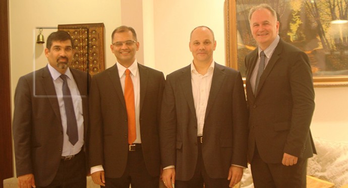 Слева направо: 1. Д-р Махеш Кумар Сингх (главный советник по исследованиям и инновациям),2. Субхаш Мотвани (основатель Namaste Tourism), 3. д-р Норберт Ревай-Бере (генеральный консул Венгрии), 4. д-р Ласло Сабо (заместитель министра иностранных дел и торговли Венгрии).