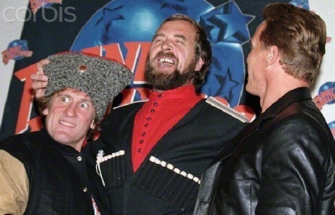 Жерар Депардье и Арнольд Шварценеггер на открытии ресторана «Планета Голливуд», 1996 год.![]()