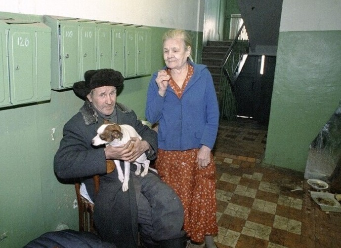 Бывший владелец квартиры по Коровинскому шоссе, д. 8 Н. К. Фокин проживает в подъезде собственного дома, т. к. в результате мошенничества с приватизацией оказался бомжем. 1994 год.![]()