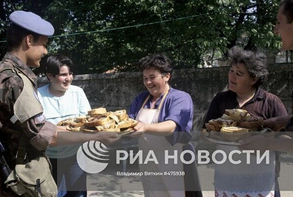 Югославские женщины угощают десантников домашней выпечкой. Российский воздушно-десантный батальон сил ООН по поддержанию мира в Югославии. Хорватия. Город Вуковар. 1992.![]()