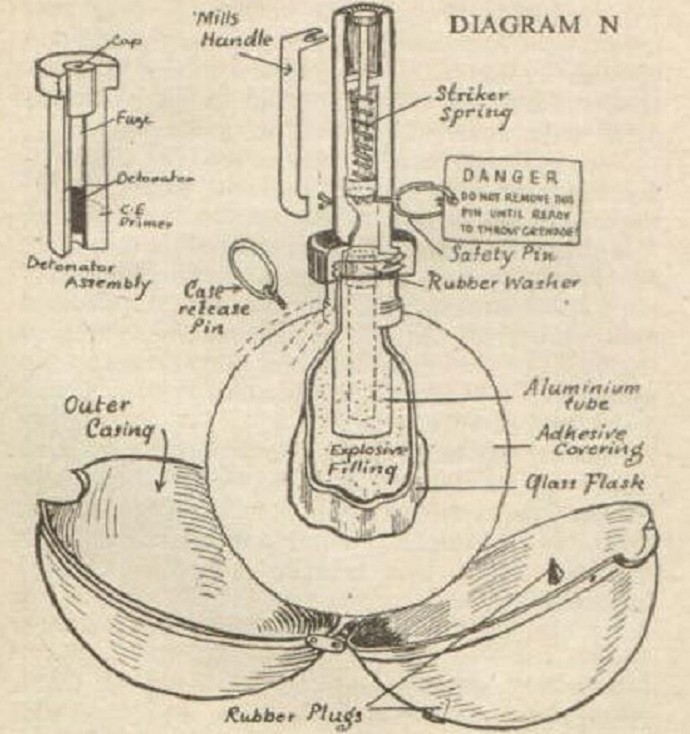 Граната ST ведь неспроста называется «липкой». Конструктивно она представляла собой стеклянный шар, либо сосуд другой формы по типу колбы с пластмассовой ручкой. А сверху шар закрывался в металлическую оболочку аналогичной формы, которая должна была защищать действующую часть от повреждений при транспортировке. Работала она следующим образом: в бою перед использованием металлическая оболочка снималась, обнажая этот самый стеклянный шар, покрытый клейкой вязкой массой, который обычно используется в ловушках для птиц. Для обеспечения безопасности владельца на гранате помещался предохранительный рычаг.