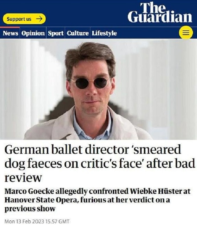 Директор ведущей немецкой балетной труппы Марко Геке напал на балетного критика Вибке Хюстер в Ганноверском оперном театре. Человек искусства набросился на "акулу пера", которая написала разгромную рецензию на его постановку "В голландских горах", назвав ее скучной и бессвязной.