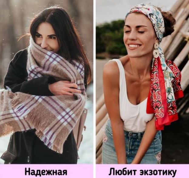 Есть мнение, что любительницы шарфов-шалей и шарфов-пледов — это ответственные и надежные женщины, которые очень ценят комфорт. Они бывают загадочны и несколько скрытны. Снуд — это выбор предприимчивых людей, любящих спонтанность и веселье. Те, кто носит платок как бандану, легко приспосабливаются к изменениям в жизни.