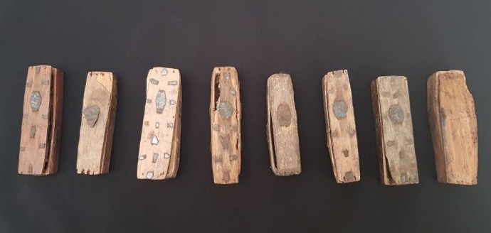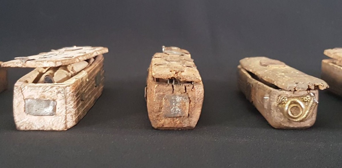 Гробы были поставлены на трех вырубленных в сланце полках, расположенных друг над другом. На двух нижних рядах было по 8 гробов, и еще один возвышался над остальными, уложенный на самую верхнюю полку в одиночестве. Все лежащие внутри фигуры уникальны и предположительно имеют портретное сходство с некими людьми. Они наряжены в аккуратно сшитые (и также уникальные для каждой фигурки) похоронные одежды, что лишь подтверждает, что все они символизируют каких-то определенных личностей.