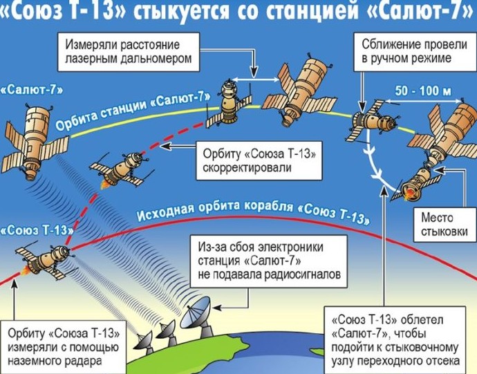 Руководивший полетом с Земли космонавт Валерий Рюмин очень точно описал сложившуюся ситуацию: космонавтам на корабле «Союз-Т» нужно было состыковаться фактически с 20-тонным булыжником, который «Салют-7» представлял собой на тот момент.