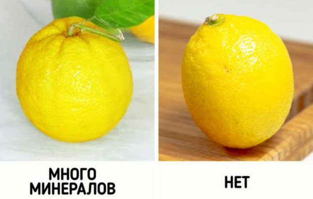 В первую очередь хороший лимон можно определить по его весу и толщине кожуры. С виду плод может казаться небольшим, но должен быть тяжелым. Преимуществами являются также тонкая кожура и ямка в области плодоножки с линиями от нее. Они свидетельствуют о том, что в лимоне высокое содержание минералов.