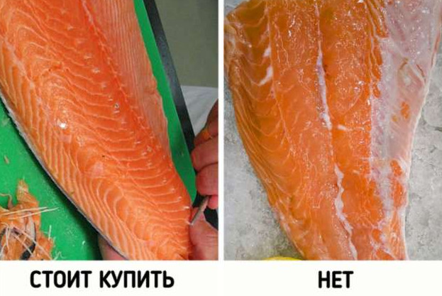 Еще один признак — это цвет. Лососевые, выращенные на ферме, обычно светло-розовые цвета, а дикие — более темных оттенков. Если на поверхности мяса есть серые или коричневые пятна, это тоже говорит о том, что рыба хранится уже очень долго.