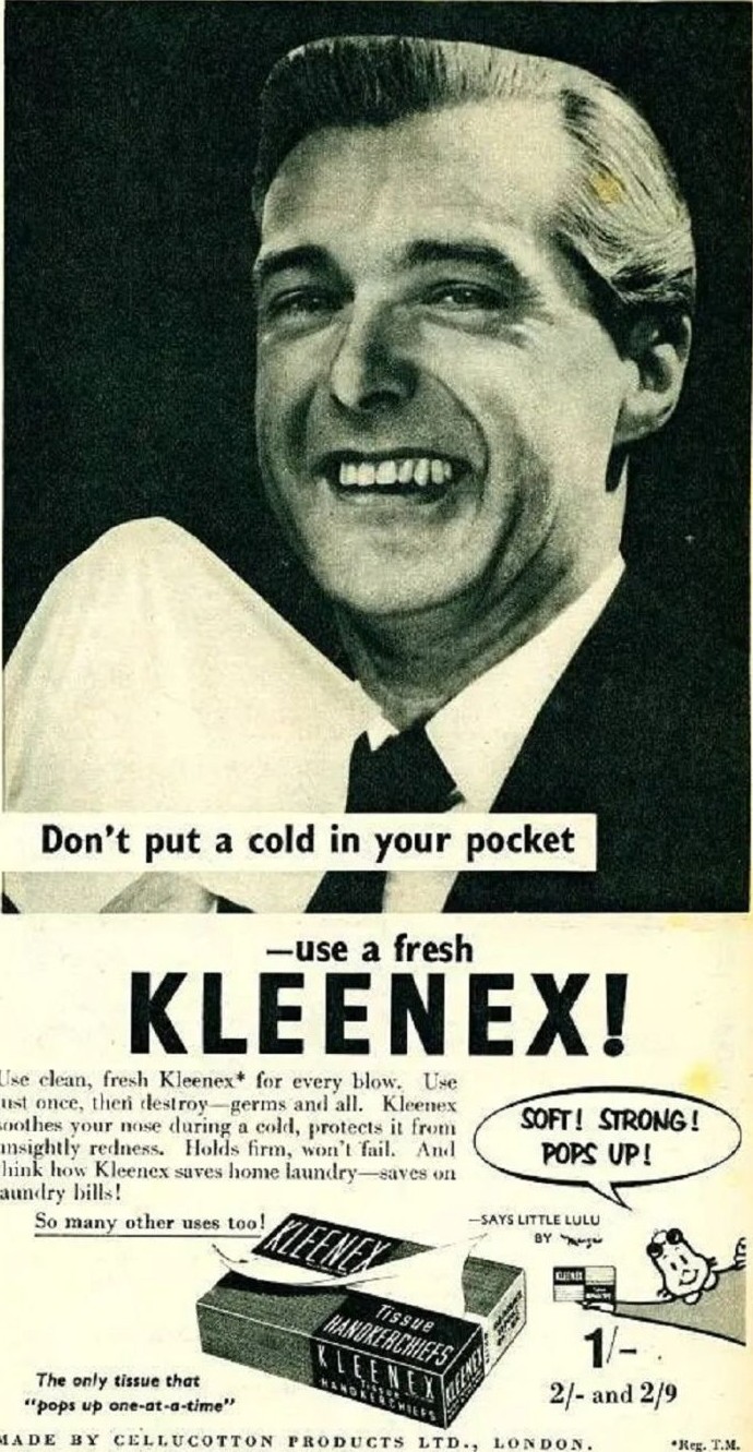 В России их чаще называют бумажными платочками. Их также изобрели умельцы из Kimberly-Clark - когда думали куда деть избыток целлюлозы. Новый продукт назвали Kleenex и запустили массовую рекламу. Через несколько лет салфетки были уже в сумочке у каждой американской дамы.