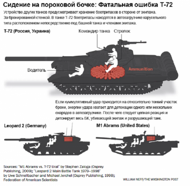 Все потому, что, если у большинства западных танков боевая укладка находится в задней части башни, в советских танках Т-72 снаряды хранятся вокруг экипажа и под ним. Когда кумулятивная струя от снаряда или гранаты прожигает броню 72-го, внутри боевого отделения образуется область повышенного давления, что в свою очередь с высокой долей вероятности приводит к подрыву боевой укладки снарядов. Из-за специфики расположения боеприпасов происходит направленный вверх взрыв, из-за чего башню советской машины и отрывает. Другими словами, в случае с кумулятивными снарядами практически нет никакого значения, было ли попадание совершено непосредственно в боевую укладку или нет. Если броню танка удалось пробить, то скорее всего машина и ее экипаж погибнут.