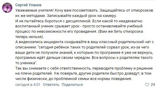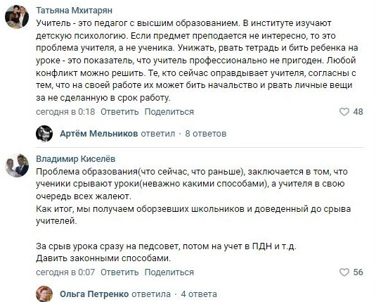 Видео с записью инцидента быстро распространилось по интернету. Пользователи, как обычно разделились на два лагеря, но в этот раз на стороне учителя оказалось большинство. Педагога поддержали и родители других учеников класса, сообщив, что дети порой целенаправленно срывают уроки.