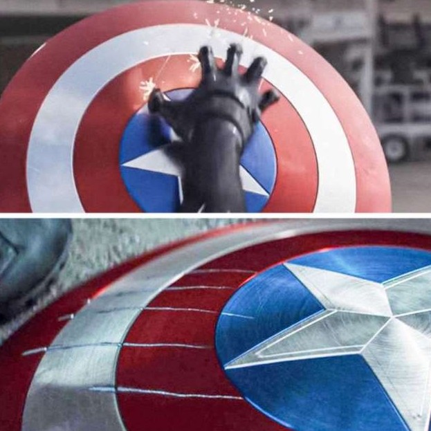 Те, кто следят за приключениями героев вселенной «Марвел», знают, что щит Капитана Америки сделан из вибраниума и практически неуязвим ко внешним воздействиям. Но после сражения с Черной пантерой на нем почему-то остаются глубокие царапины, которые нам специально показывают крупным планом. Ответ прост: в снаряжении Черной пантеры тоже есть суперпрочный вибраниум, который запросто может повредить щит из такого же материала.