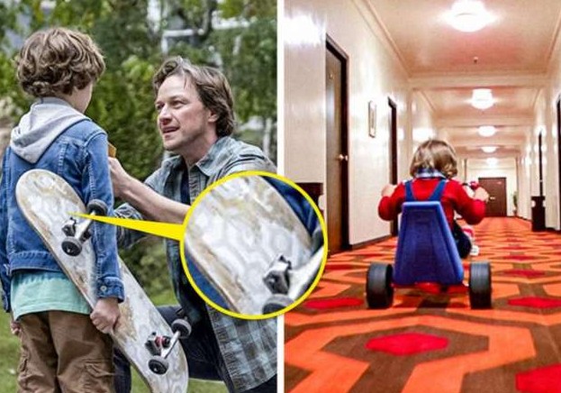 Присмотритесь: оказывается, на обратной стороне скейтборда изображены какие-то смутно знакомые ромбы. Да это же знаменитый узор ковра из отеля, который нам показали в фильме «Сияние». Догадаться, почему так было сделано, несложно — обе киноленты сняты по мотивам произведений Стивена Кинга.