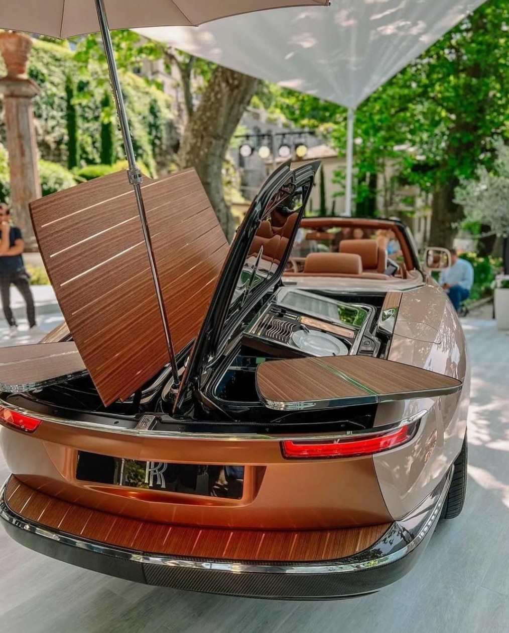 Внутри багажника можно увидеть мини-кухню для пикников, холодильник, раскладные столики и приборы с именной гравировкой.