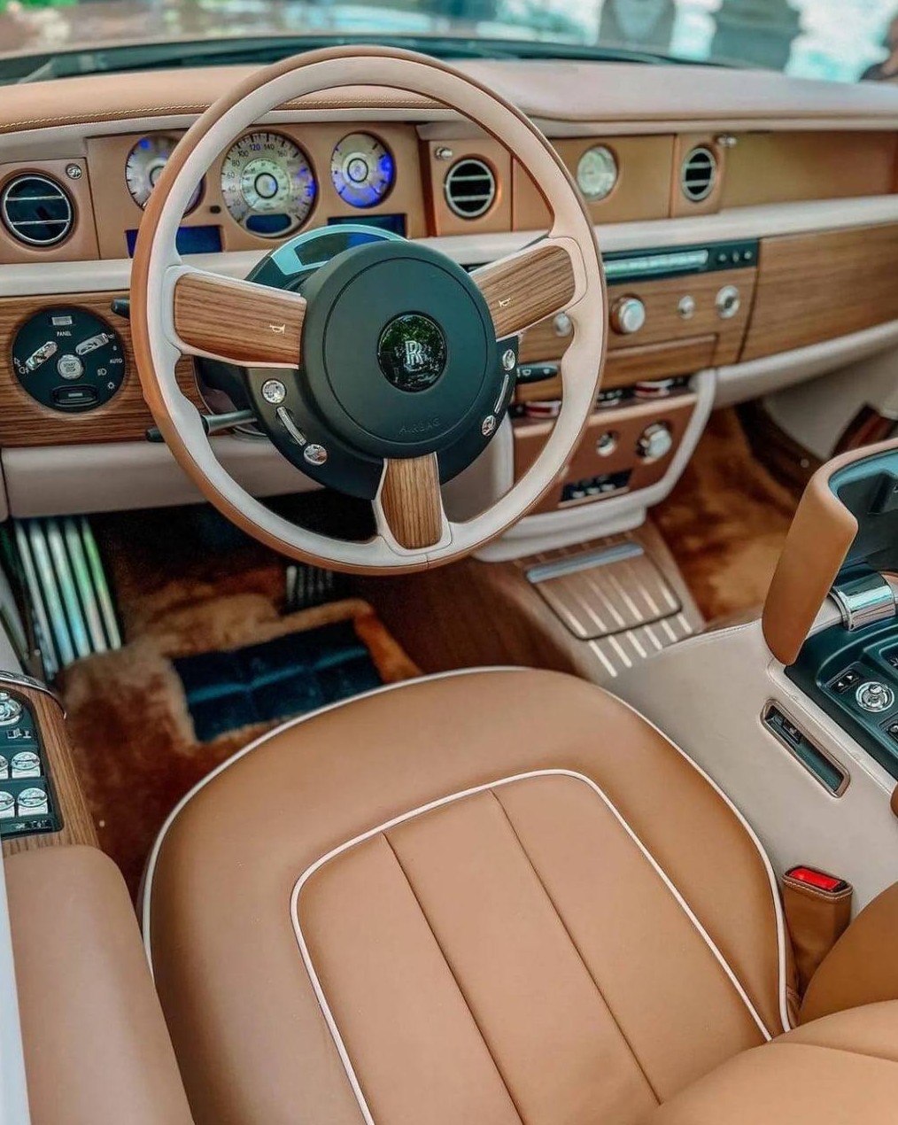 Что он получил за такие деньги? Автомобиль выполнен в цвете «сигары с оттенком виски» c перламутровым отливом. Отделка интерьера — из бронзы, золота, алюминия и хрусталя. Крышки багажника (да, их две) покрыты снаружи шпоном королевского орехового дерева.