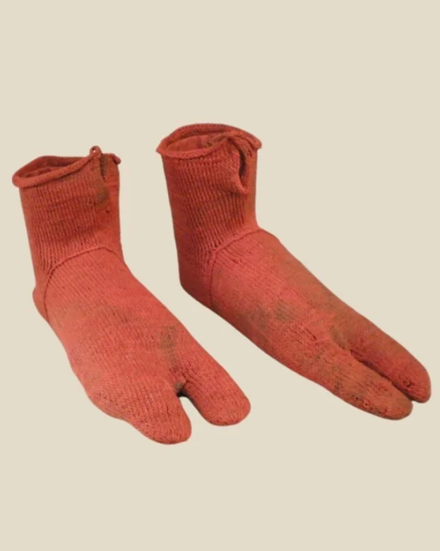 Носки нашли в Египте, в захоронениях. Они были сделаны для сандалий, именно поэтому большой палец отделён от остальных. Их сшили методом нолбиндинга — вязания одной иглой. Это кропотливый процесс, требующий терпения и мастерства.