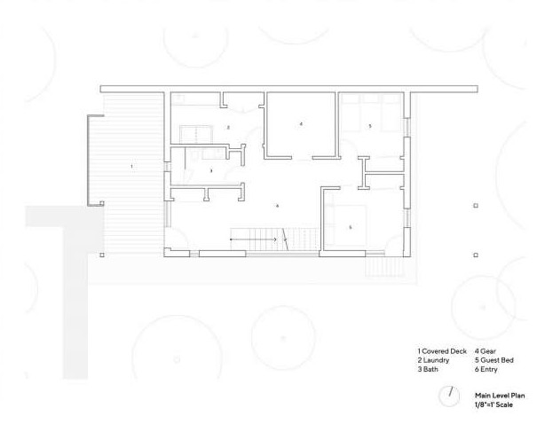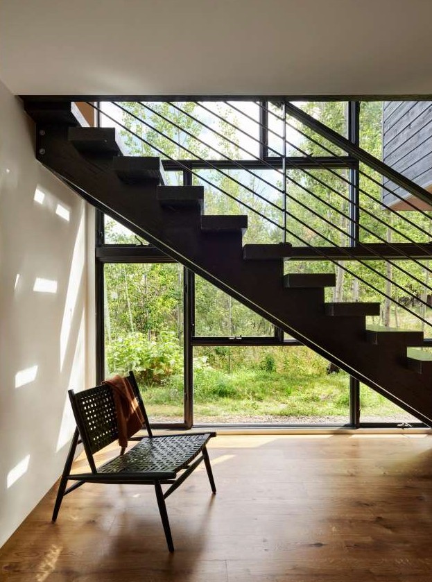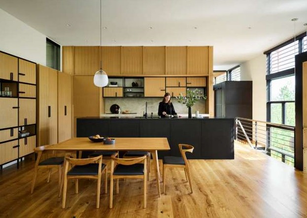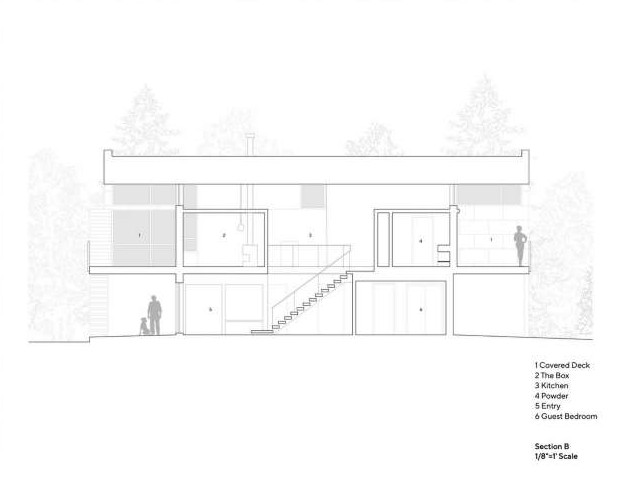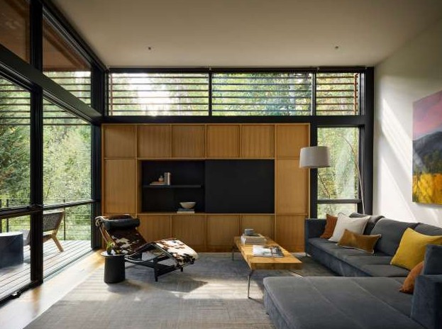На верхнем уровне размещены социальная зона открытого плана с кухней, столовой и гостиной, а также главная спальня с ванной комнатой. Консольные выступы, обшитые древесиной кедра, обеспечивает тесную связь интерьера с окружающим ландшафтом. Высокие потолки отмечены непрерывной полосой ленточных окон, которые позволяют естественному свету проникать внутрь.