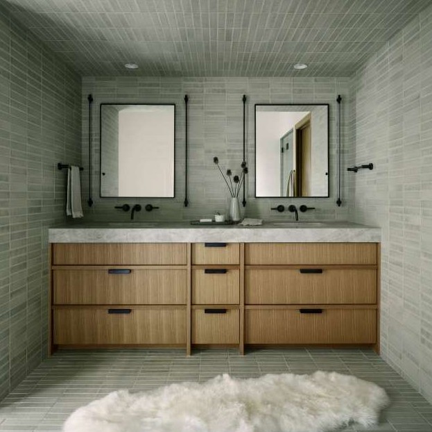 Главная ванная комната приобрела стильный современный вид. Отдельно стоящая ванна была перенесена ближе к окну, а потолок и стены отделаны плиткой и теплым деревом. Выполненный из кварцита новый туалетный столик добавляет к пространству гламурный штрих.