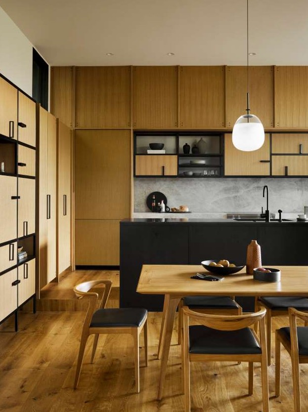 В обеденной зоне подвесные полки были заменены стильным шкафом, который был разработан CLB Architects и изготовлен в сотрудничестве с мастером по металлу и столярной мастерской JH Cabinets. Мебель столовой включает в себя стулья Duda с эргономичной спинкой и стол Amsterdam с четкими геометрическими углами от Sossego Design, а также подвесной светильник испанской компании Vibia .